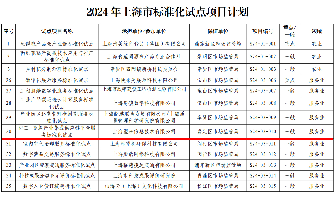 近日,,上海市市场监督管理局公布56个2024年上海市标准化试点项目计划,,尊龙时凯旗下化塑汇申报的“化工·塑料产业集成供应链平台服务标准化试点”项目入选,,,,成功获批立项。。
